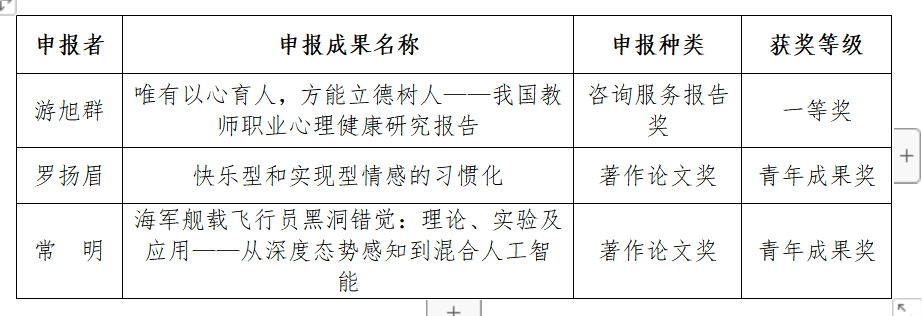 第九届高等公司科学研究优秀成果奖(人文社会科学)已经公示结束,公司共有3项成果拟获奖。游旭群教授的《唯有以心育人,方能立德树人——我国教师职业心理健康研究报告》获得一等奖,罗扬眉教授的《快乐型和实现型情感的习惯化》和常明教授的《海军舰载飞行员黑洞错觉:理论、实验及应用——从深度态势感知到混合人工智能》获得青年成果奖。