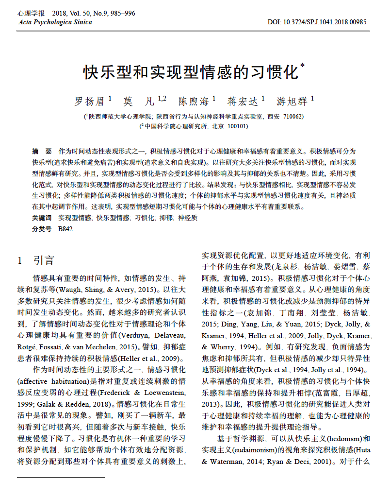 《快乐型和实现型情感的习惯化》